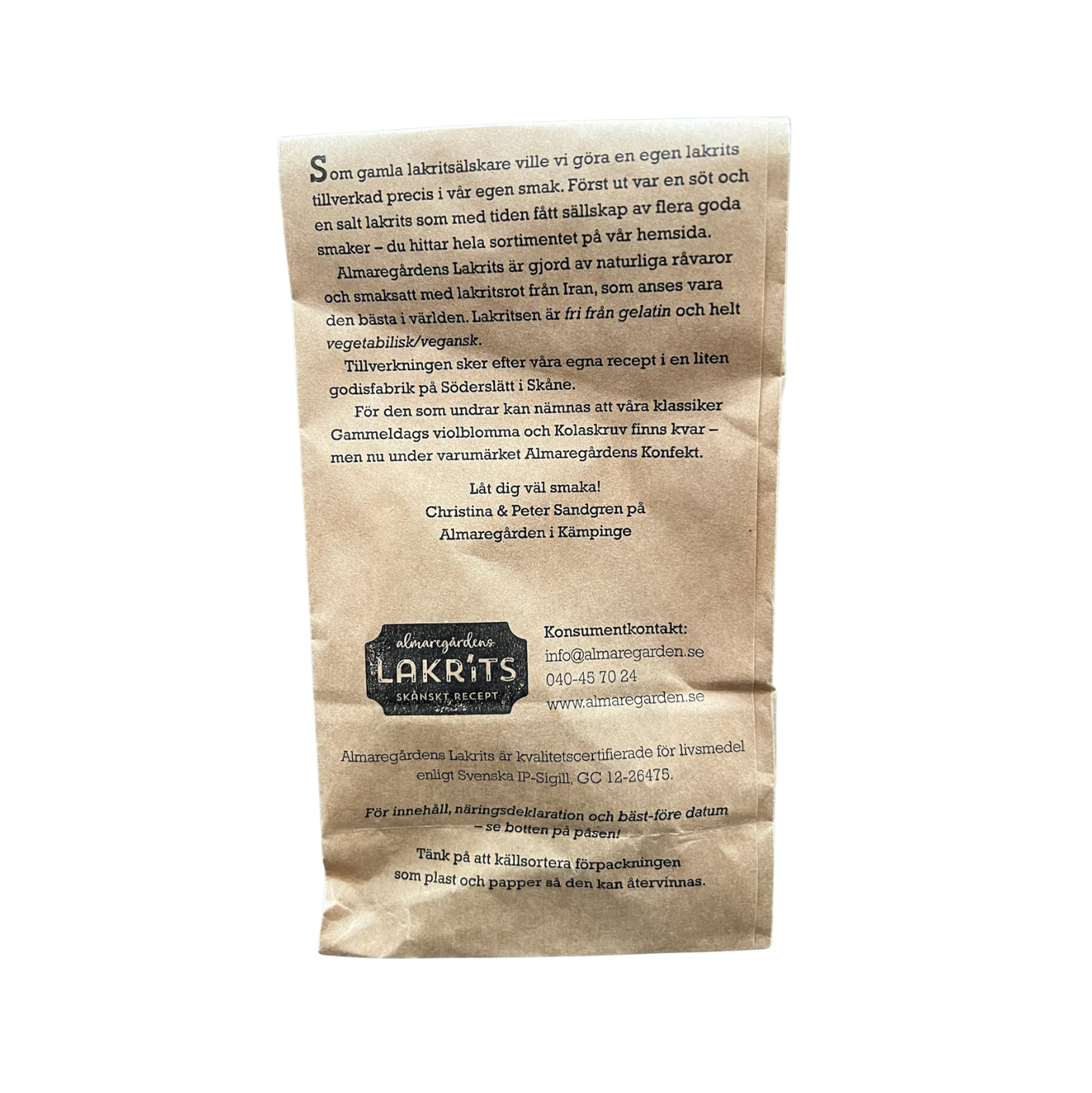 Almaregårdens Lakritz natur wird in einer Papiertüte geliefert. Das Lakritz ist darin zusätzlich in einer zweiten Tüte luftdicht verpackt, um dessen Frische und die weiche Konsistenz zu erhalten.