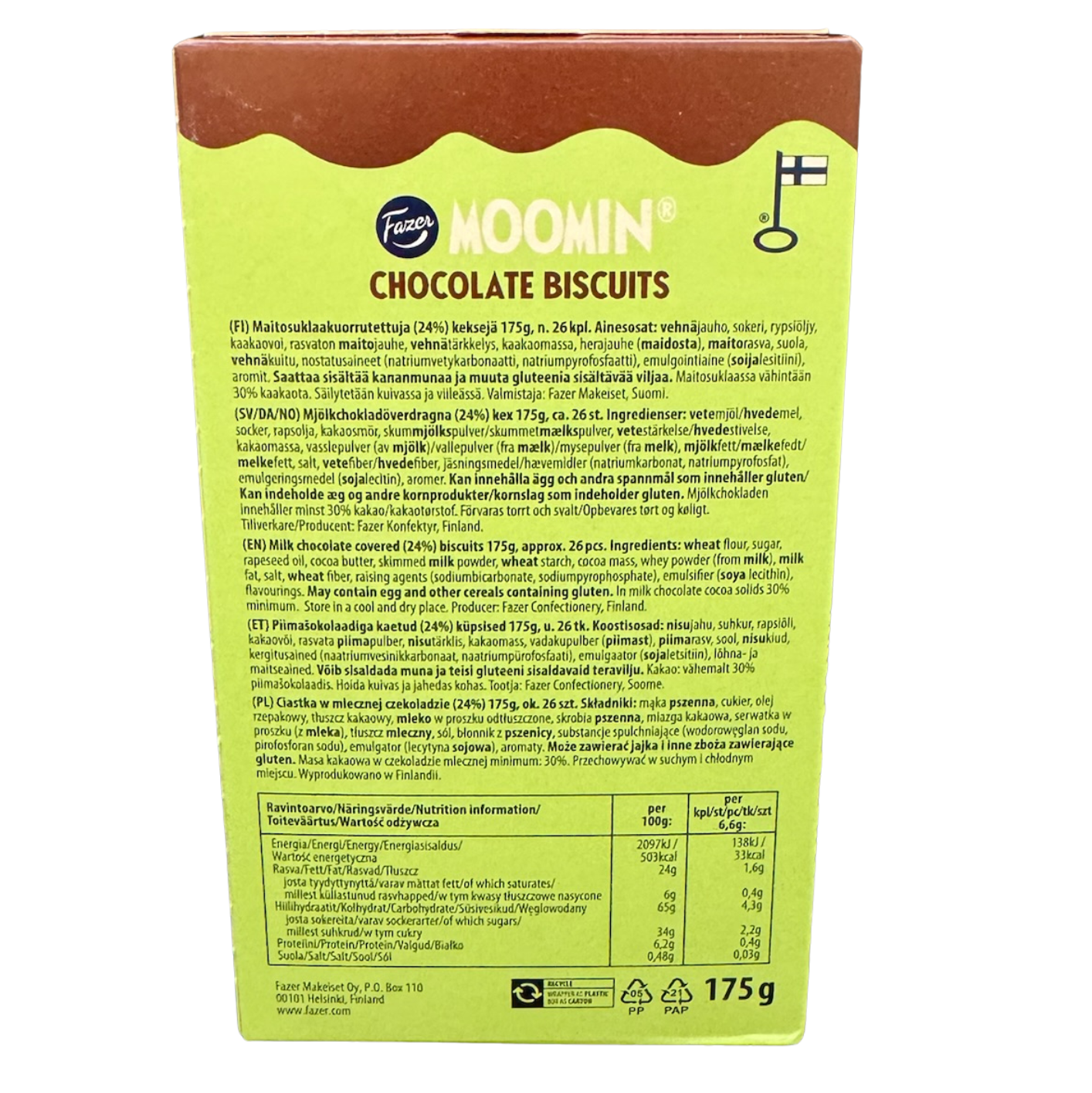 Fazer Moomin Schokoladen-Kekse sind der ganz große Knabberspaß mit unterschiedlichen Moomin-Motiven für die ganze Familie und überzogen mit köstlicher Schokolade. Die Kekse in der hübschen Moomin-Verpackung sind auch ein schöner Geschenkartikel.