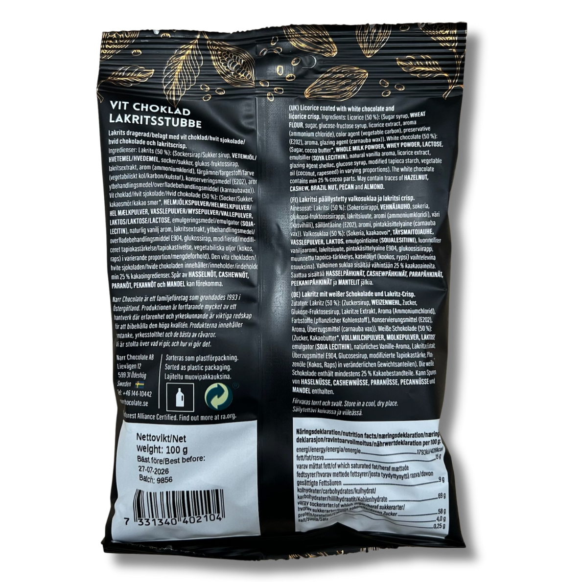 Narr Lakritsstubbe weiße Schokolade aus Schweden sind feine Lakritz-Kugeln mit Lakritz-Crisp und einem Überzug aus weißer Schokolade.