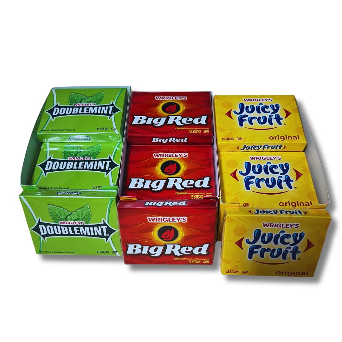 Sie sind zurück! Die beliebten Wrigley's Kaugummis – Doublemint, Big Red und Juicy Fruit – feiern ihr Comeback im Zuckerladen.